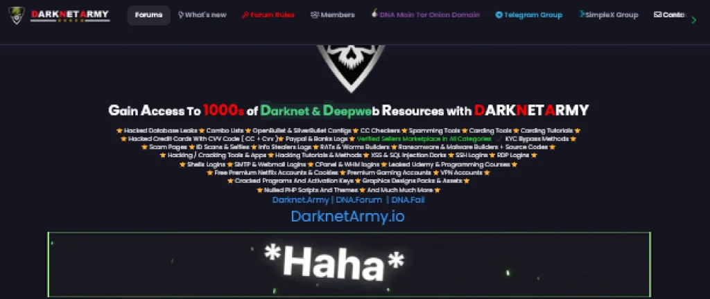 DarkNet Army Forum, which is also known as DNA, is an online forum that is mainly based on hacking, carding, topics, discussions, and listings related to drugs and chemicals. It is a place where people with the same interests can come together, share information, and learn from each other. The forum includes thousands of discussion threads that includes topic like cybersecurity tools, digital courses, leaked data, and account information.